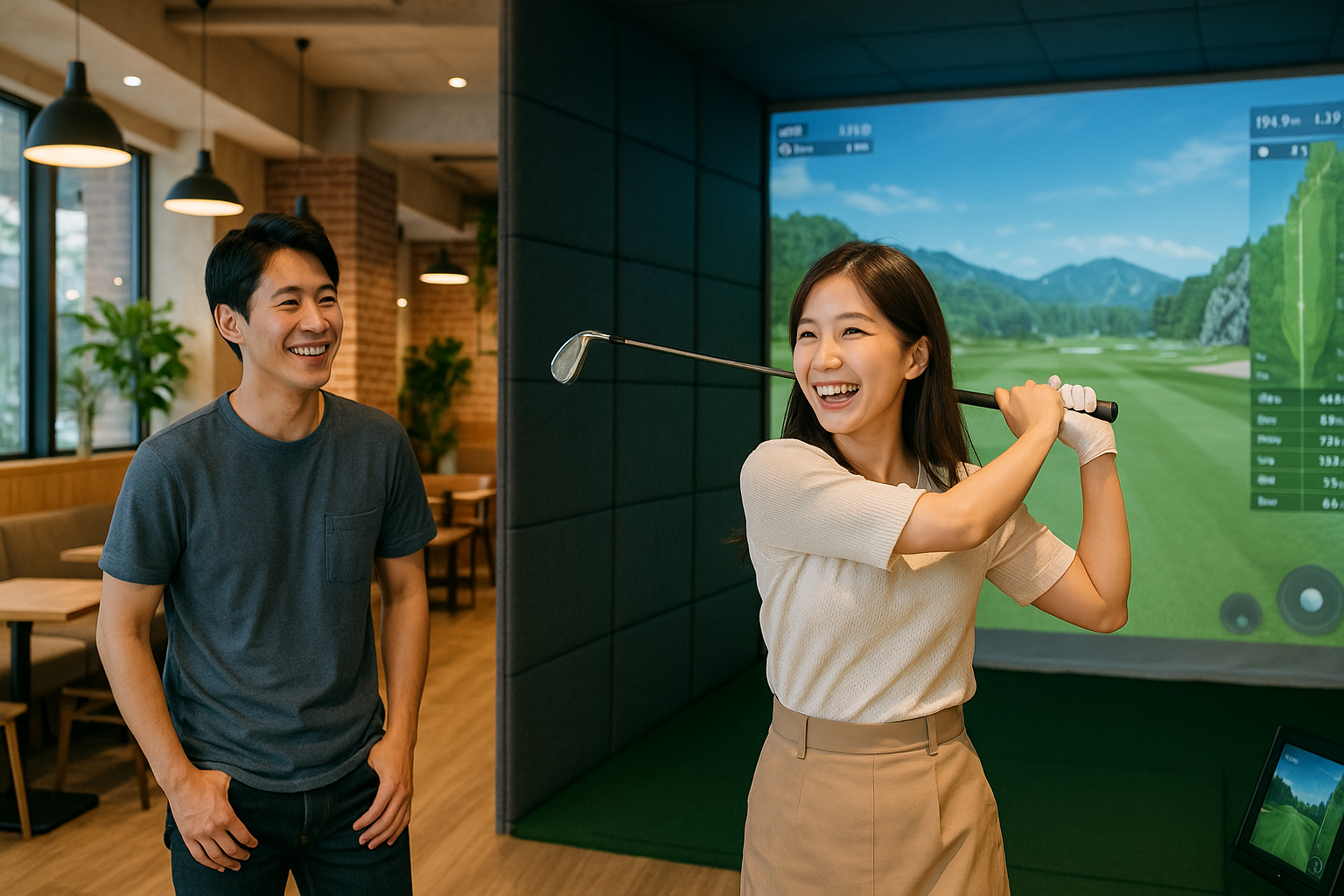 クラブを握ったことがなくても大丈夫。リゾートのようなくつろげる内装と、プロ仕様のインドアゴルフのシミュレーターが魅力のスポットです。飲み物を飲みながら、二人でゲーム感覚でスイングを楽しめます。